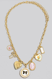 The PEARL BOW CHARMS NECKLACE features a delightful design that catches the eye. With its intricate bow and beautiful pearls, this necklace adds a touch of elegance to any outfit. You can wear it for a casual day out or dress it up for a special occasion. This versatility makes it a must-have accessory, so whether you're going to a party or simply enjoying a day with friends, this necklace is an excellent choice.