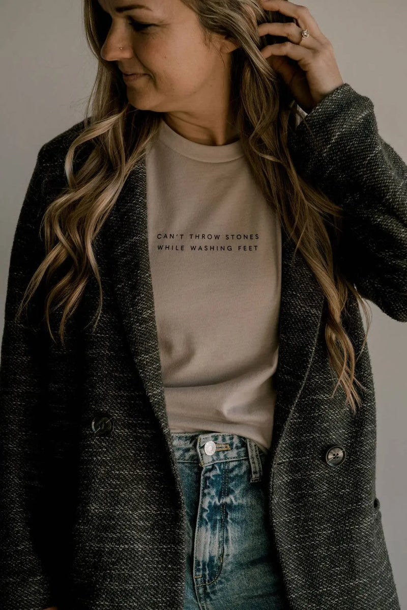 “He who is without sin among you, let him throw a stone at her first.” ‭‭John‬ ‭8:7 This tee is inspired by a story found in John chapter 8 in the Bible. We are called to extend compassion, kindness, and love. It doesn’t mean sin is excused, it means judgement isn’t ours but God’s. Are you a stone thrower or a foot washer? Can’t throw stones while washing feet.