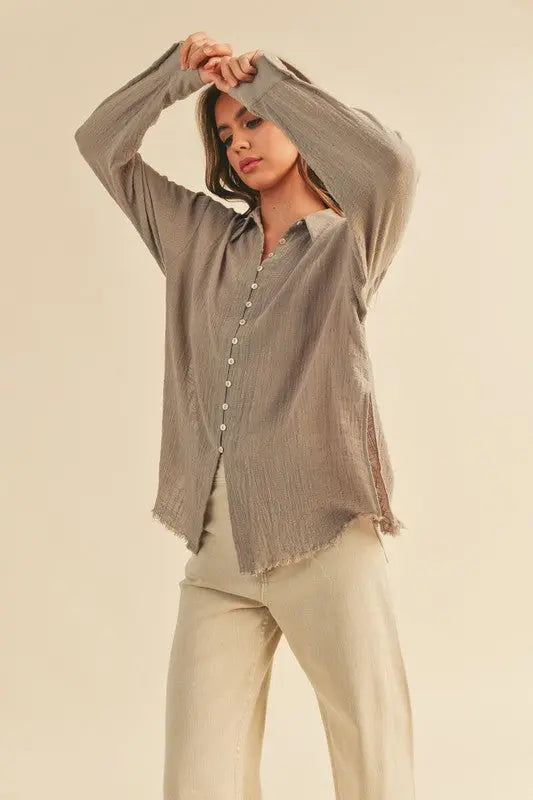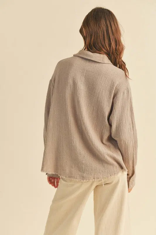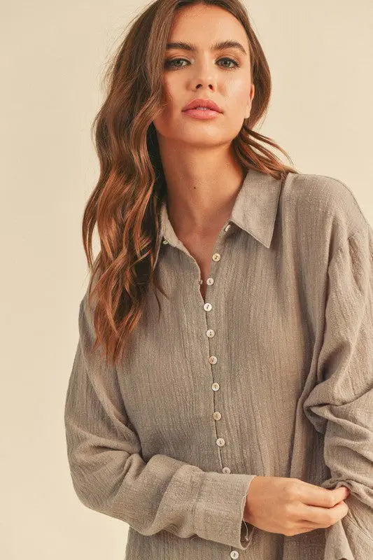This classic, button down gauze top in taupe features an oversized fit to provide effortless styling and the perfect shape for any ensemble. It's sure to become your go-to piece.