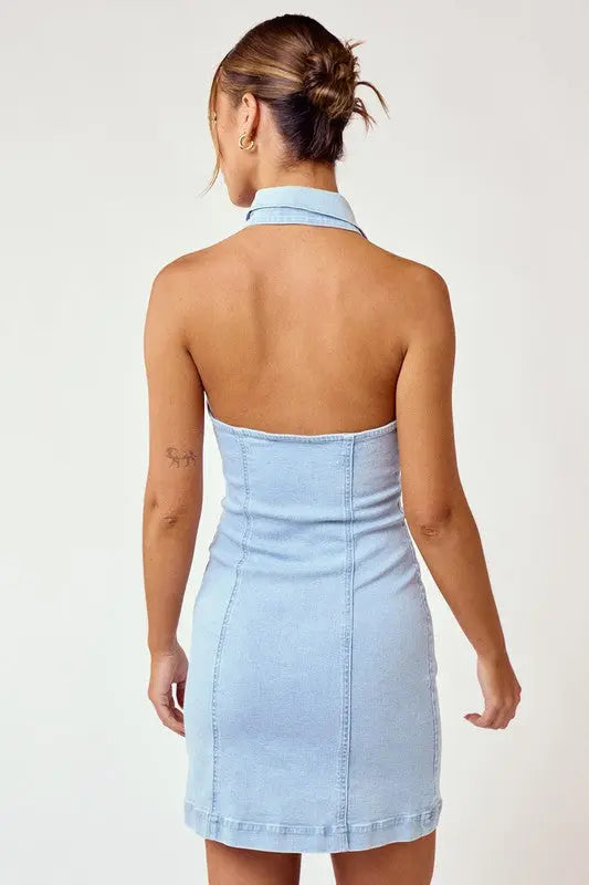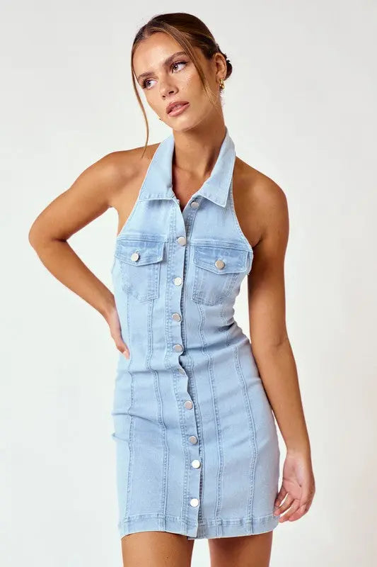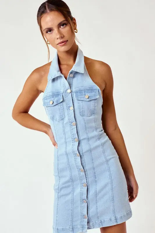 Make a statement in our washed denim halter mini dress. It features a collar, button placket, and halter neck for a classic yet stylish look.
