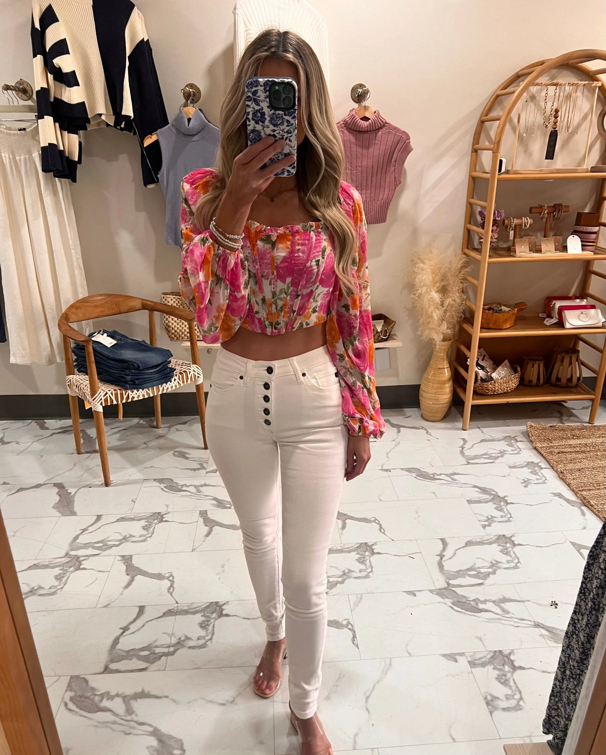 This floral chiffon crop corset is extremely versatile. You can pair it with high-waisted jeans for a casual brunch look, or wear it with a flowing maxi skirt for a more formal event. It's designed so that you can transition from day to night with ease. Because of its adaptable nature, you'll find yourself wearing it all season long. It’s definitely a wardrobe staple that complements various styles.
