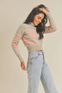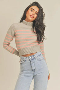 + Striped turtleneck knit sweater + Ribbed turtleneck and hem + Long sleeves with long ribbed cuffs + Semi-cropped fit Model is 5' 9" 33-25.5-36 and wears a S