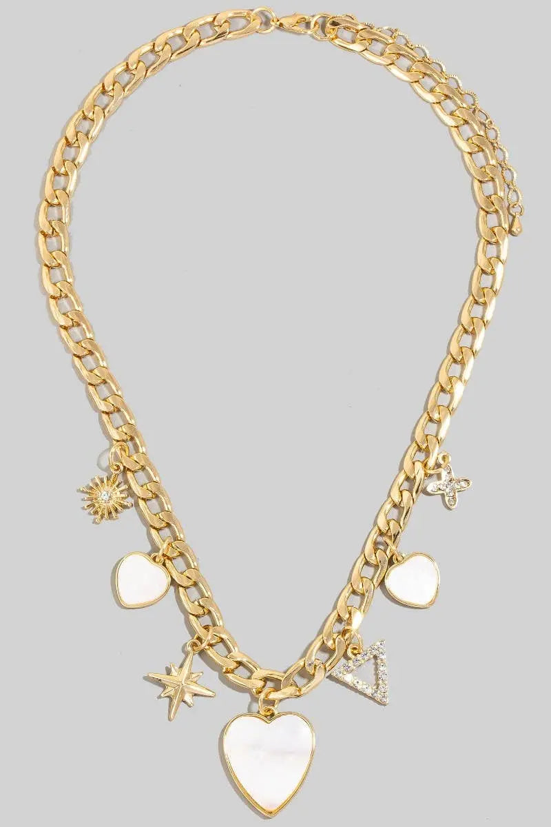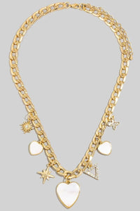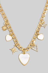 This chain necklace features a fashionable shell hearts and stars charms style. Experience the joy of accessorizing with this piece that effortlessly combines versatility and charm. 70% METAL 10% GLASS 20% SHELL
