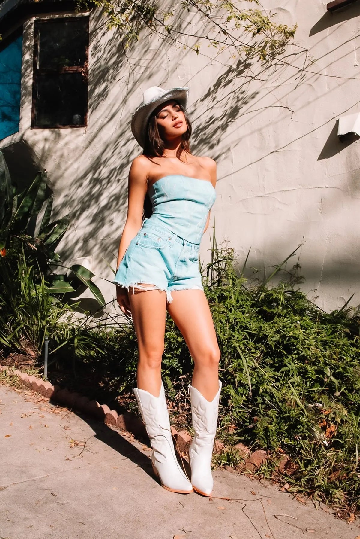 SMALL TOWN SMOKE SHOW FAUX LEATHER CORSET TOP-BLUE