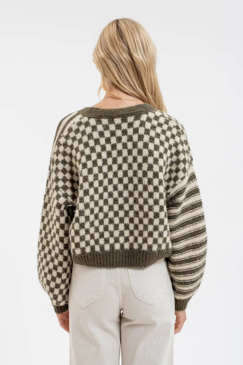 STRIPE AND CHECKERED DROP SHOULDER KNIT CARDIGAN