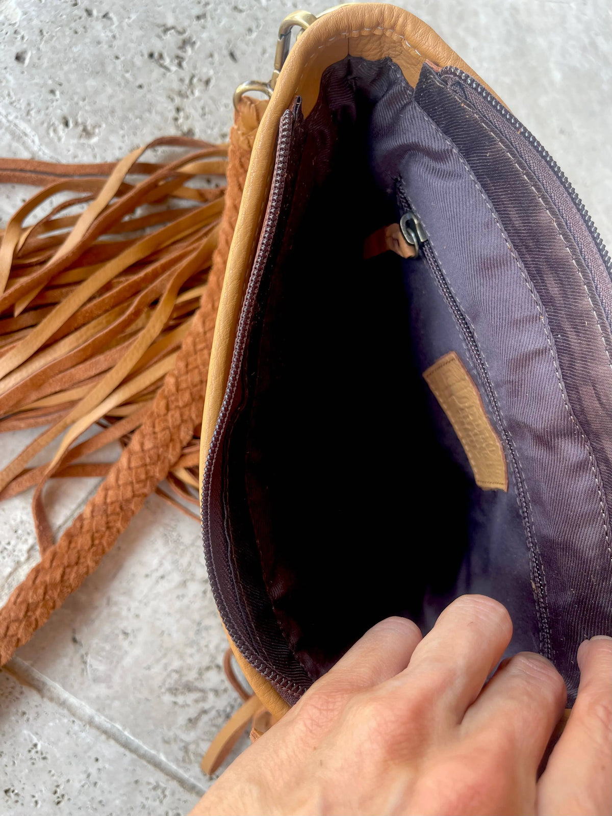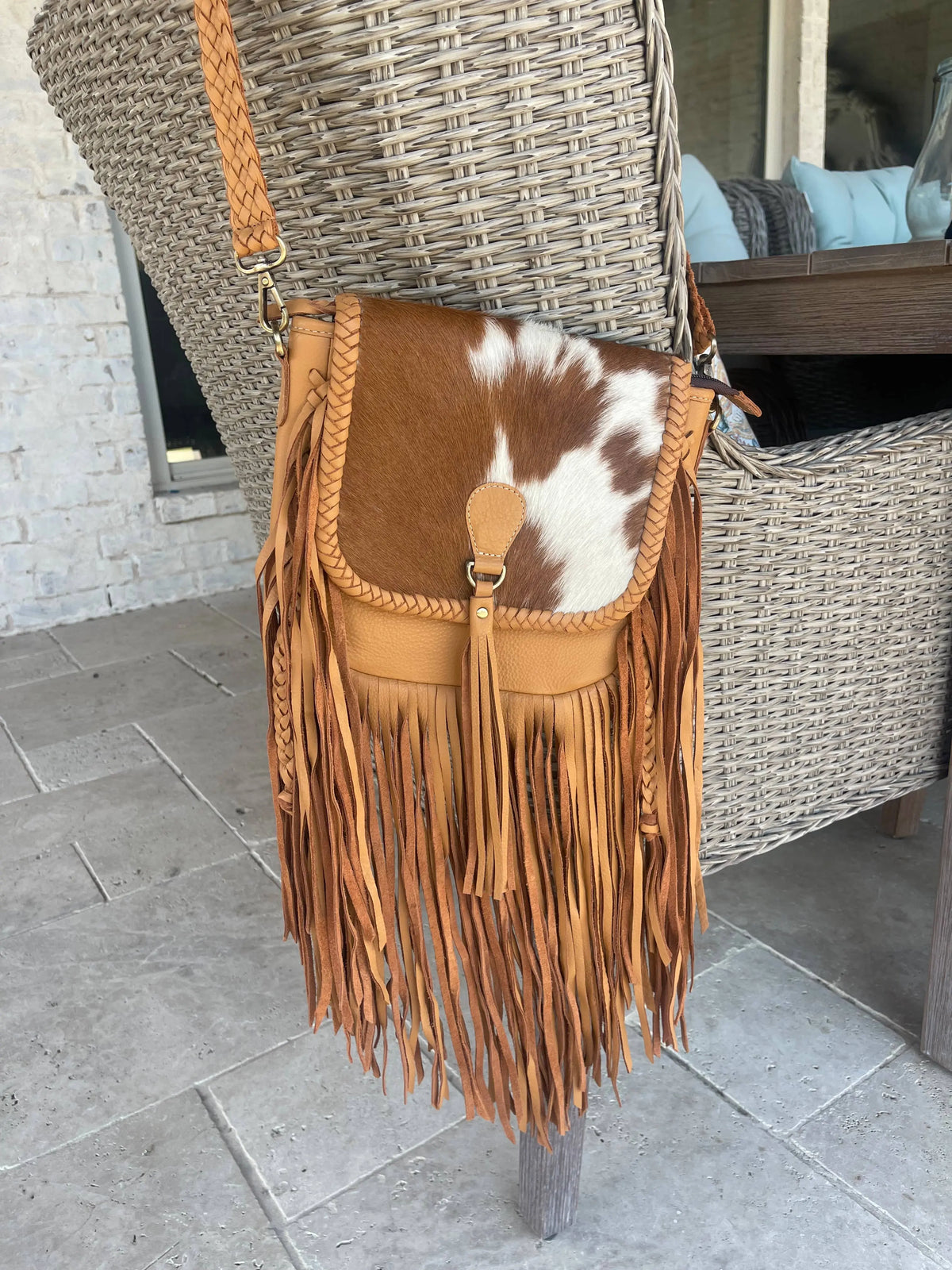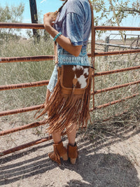 The Antonio Cowhide Western Genuine Leather + hair on cowhide Crossbody Messenger Fringe Purse Bag 100% genuine cowhide + leather Genuine hairon cowhide front and cowhide on the flap Leather on sides, bottom and back of purse Magnetic button flap closure Adjustable braided leather crossbody strap with a buckle Interior zippered pocket Outside back zippered pocket Bag measurements : Width: 10.5" x Height: 9.25" Depth: 3" Fringe Length: 15" 48" adjustable shoulder strap model is size 2, 5’4