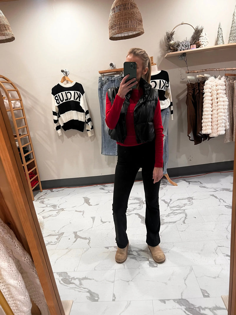 The WESTIN FAUX LEATHER PUFFER VEST-BLACK is designed with both style and functionality in mind. It features a classic black faux leather exterior that offers a sleek and modern look. This vest can easily be paired with various outfits, making it a versatile addition to your wardrobe. Whether you wear it over a casual tee or a stylish sweater, this vest enhances any ensemble, so you can look fashionable with minimal effort.