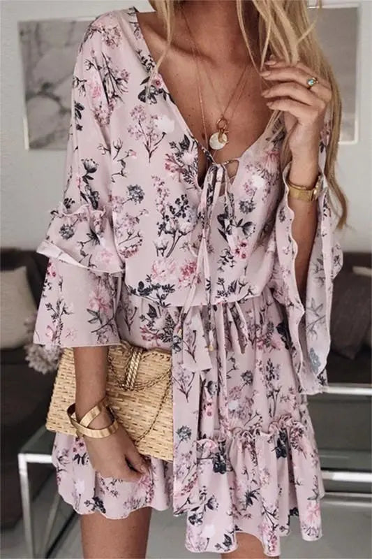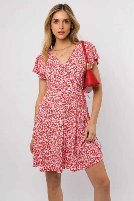 FLORAL PRINT EYELET TIERED MINI DRESS