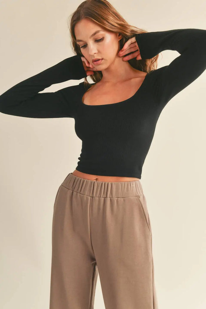 SQUARE NECK SEAMLESS LONG SLEEVE TOP-BLACK