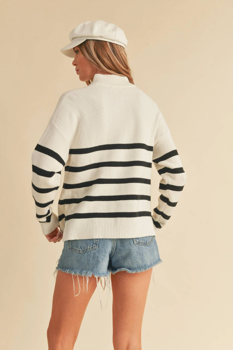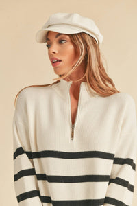 Indulge in ultimate luxury with our cozy Striped Quarter Sweater. Its oversized fit and high collar bring a touch of chic comfort to your wardrobe. The trendy zipper on the neck and contemporary dropped shoulder seams add a modern twist. Stay stylish and snug all season with this essential piece.