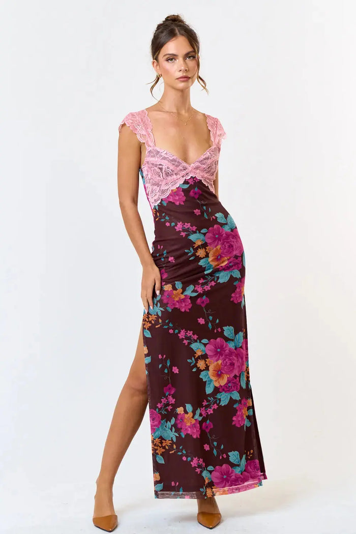 BLISSFULLY BLUSH FLORAL TIE-STRAP BUSTIER MAXI DRESS