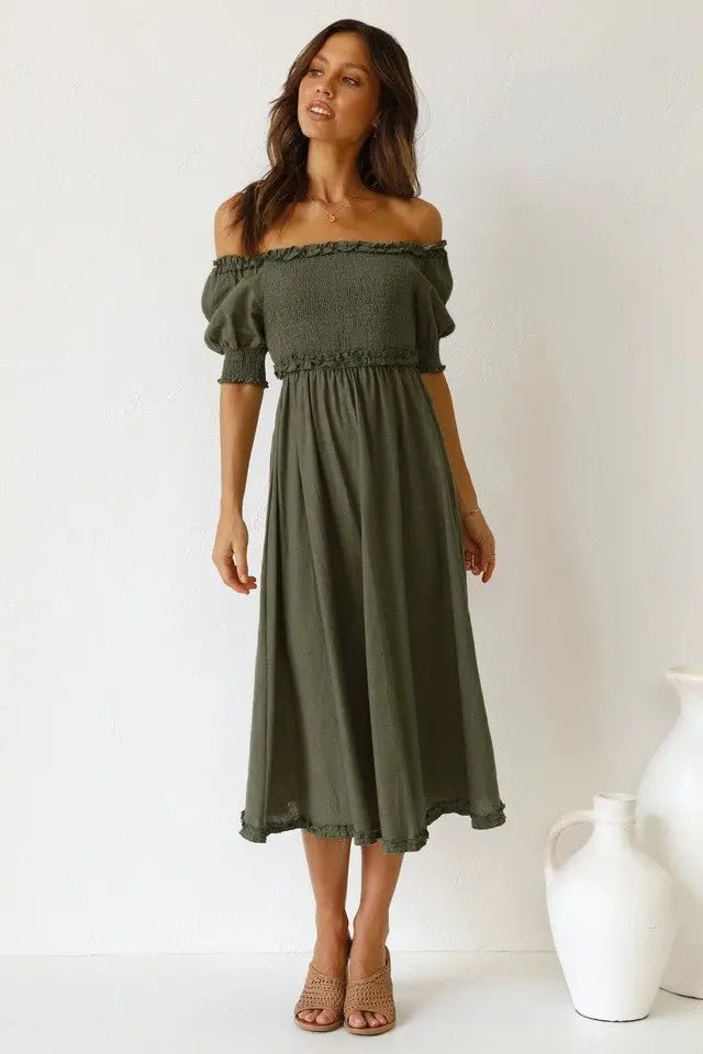 OFF THE SHOULDERS RUFFLE MIDI DRESS-OLIVE