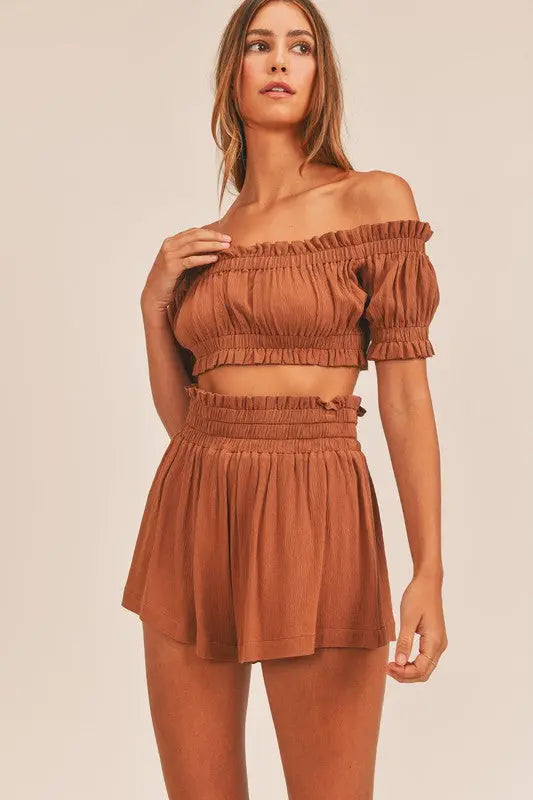 TAKE THE RISK CROP TOP TWO-PIECE SHORT SET - COGNAC
