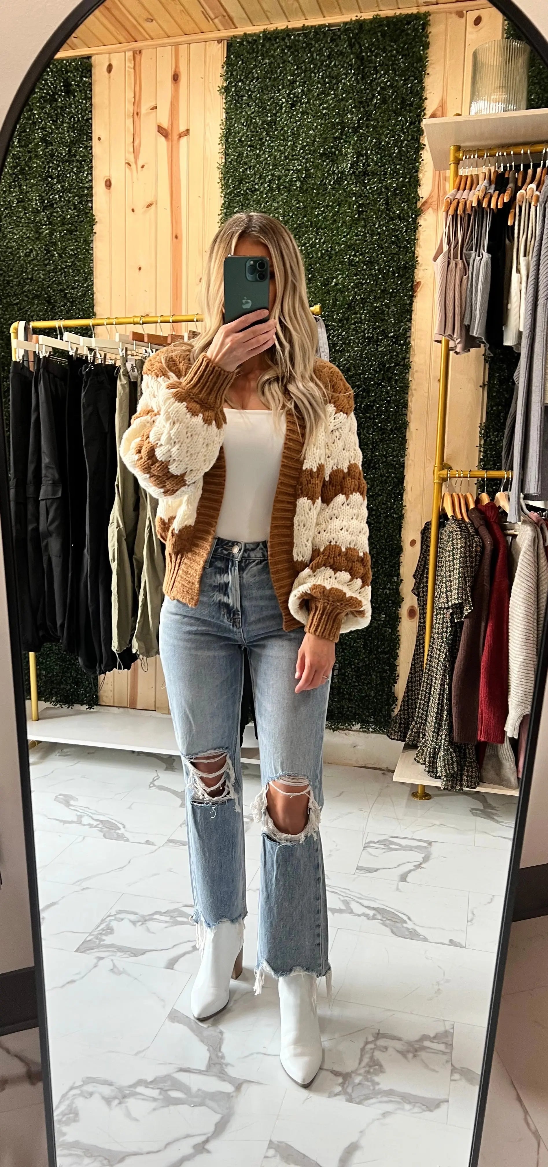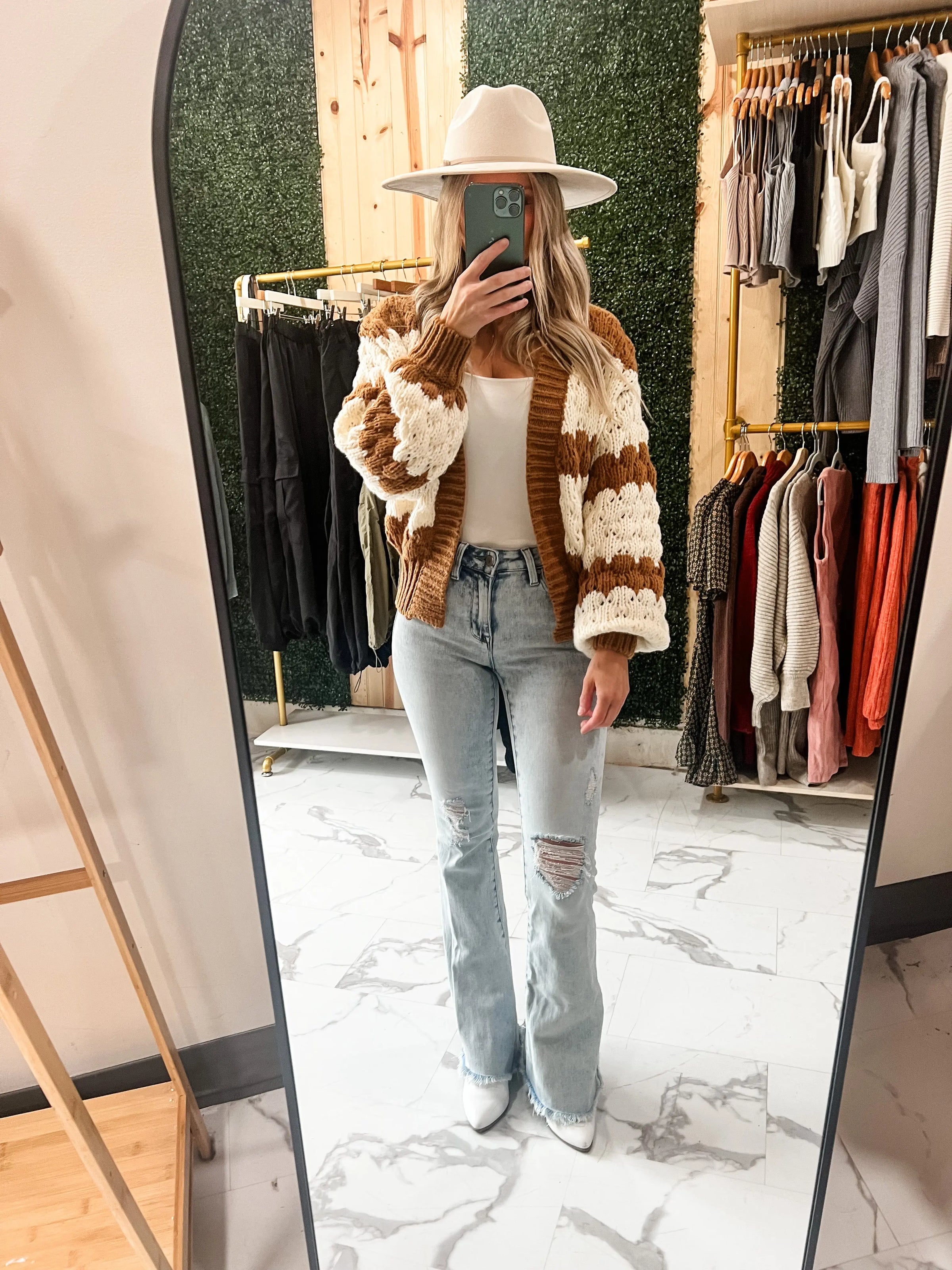 Featuring a scalloped pattern in a stripe design, Never Knit Cardigan captures effortless sophistication with its open front and bubble sleeves.